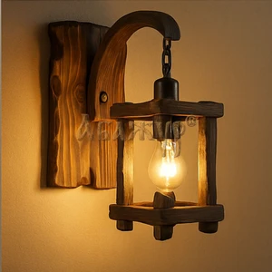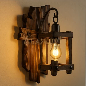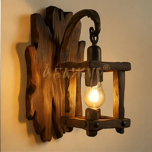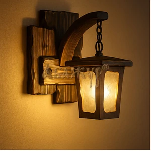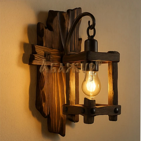 Деревянный кронштейн плавной формы удерживает фонарь на металлической цепи, формируя мягкий рассеянный свет. Такое бра органично вписывается в интерьеры под старину, загородные дома, бани, рестораны и пространства с тёплой атмосферой ручной работы.