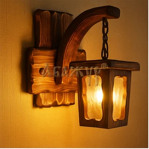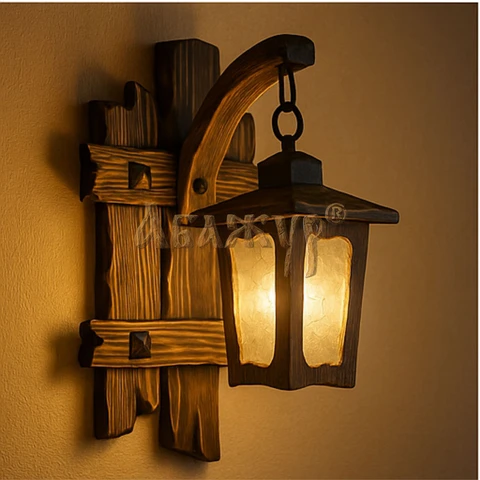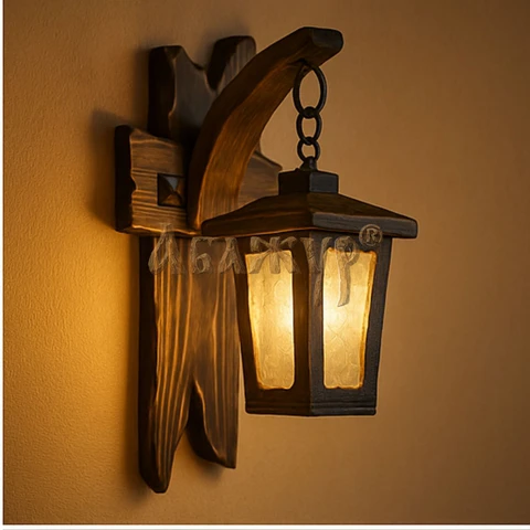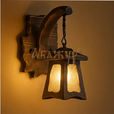 Конструкция напоминает старинный фонарь: массивная деревянная рама, изогнутый кронштейн и цепное подвесное крепление плафона. Бра даёт тёплый рассеянный свет и подходит для гостиных, коридоров, кафе, баров и интерьеров с характером.