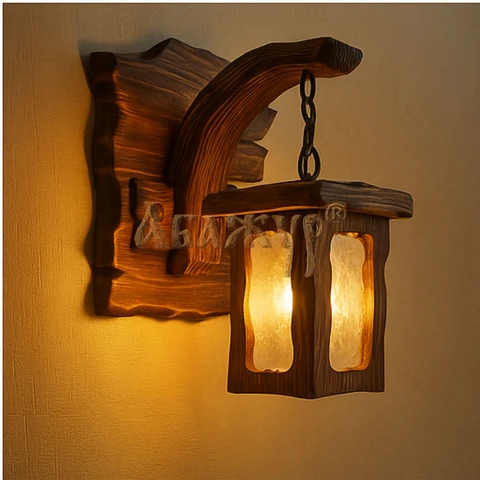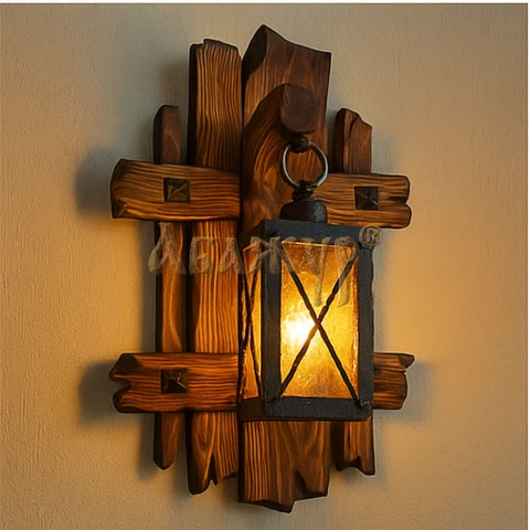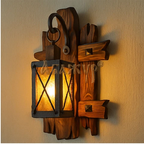 Конструкция бра напоминает старинный фонарь: массивная деревянная рама, изогнутый кронштейн и цепное подвесное крепление плафона. Свет получается тёплым и мягким, создавая уютную атмосферу в гостиной, коридоре, баре, кафе или загородном интерьере.