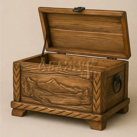 Сундуки изготавливаются из массива сибирской сосны и предназначены для хранения вещей в жилых и общественных интерьерах. В одном товарном предложении представлены разные варианты исполнения: с плоской или скруглённой крышкой, с декоративными фасадами и без резьбы, с коваными накладками и ручками.